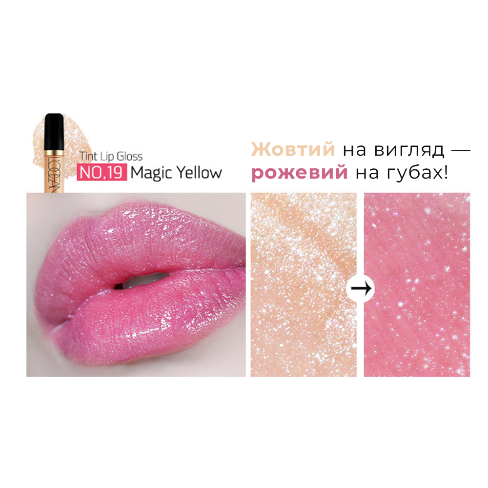 L’OCEAN Tint Lip Gloss №19 Magic Yellow — це унікальний глянцевий тінт для губ з ефектом зміни кольору: прозоро-жовта формула на губах поступово перетворюється на ніжний рожевий відтінок, адаптуючись під ваш природний pH.